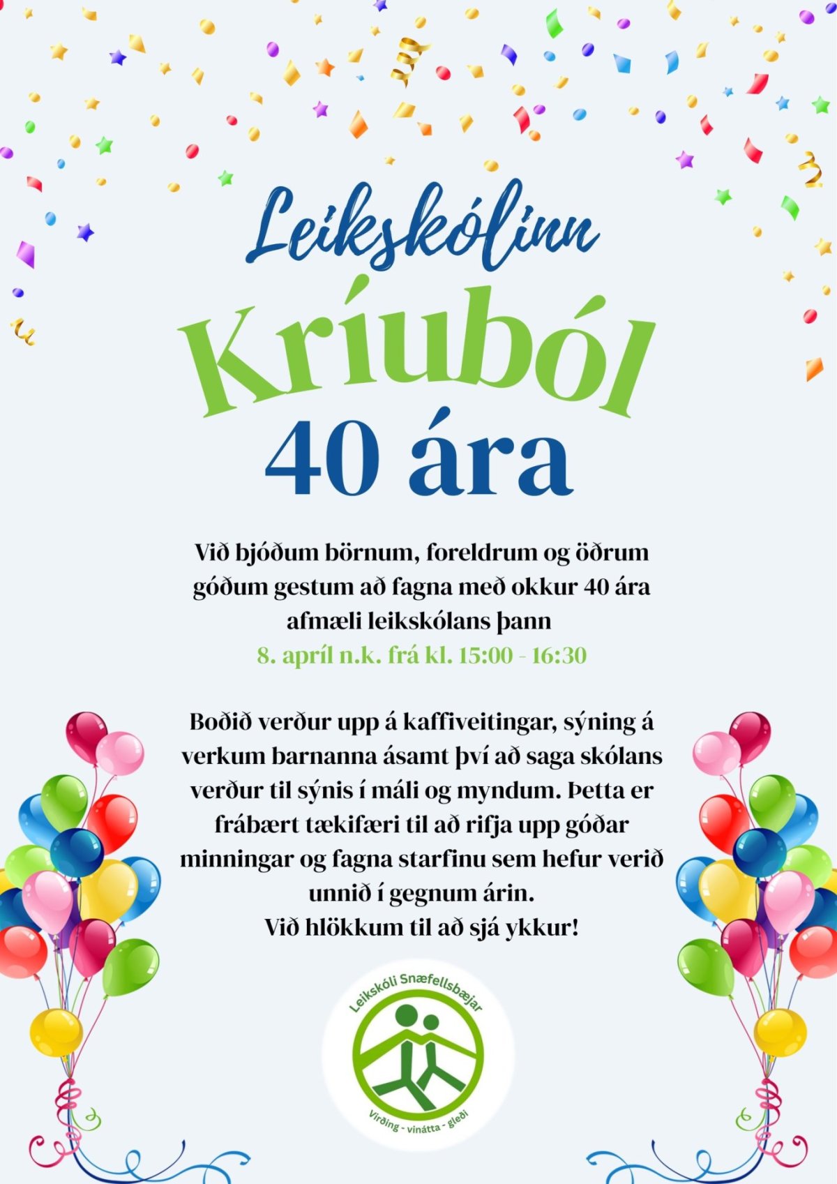 40 ár eru liðin frá því leikskólinn Kríuból var stofnaður á Hellissandi. Af þessu góða tilefni hefur verið boðað til fögnuðar miðvikdaginn 8. apríl nk í leikskólanum frá kl. 15:00 - 16:00.