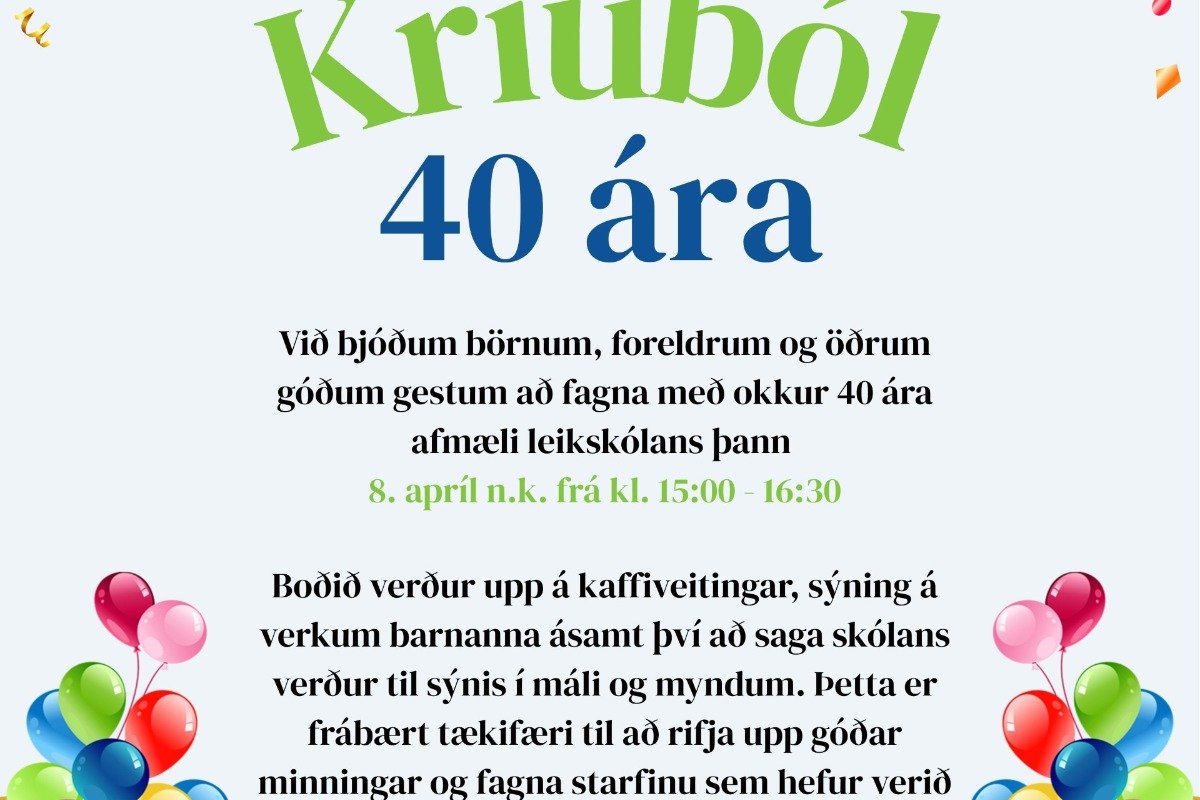 40 ár eru liðin frá því leikskólinn Kríuból var stofnaður á Hellissandi. Af þessu góða tilefni hefur verið boðað til fögnuðar miðvikdaginn 8. apríl nk í leikskólanum frá kl. 15:00 - 16:00.